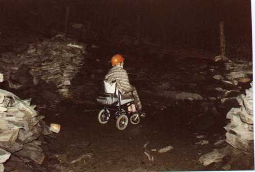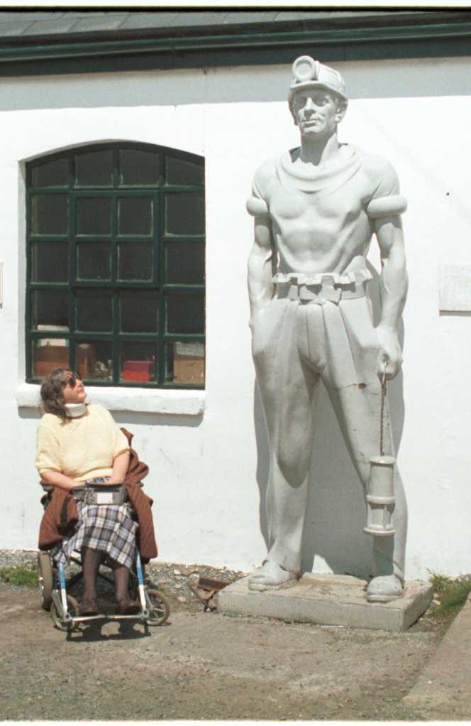 | Two pictures taken over the following years in South Wales. The first at the Big Pit Coalmine which she descended in her wheelchair and the second near the Dolocauthi Gold mines | |