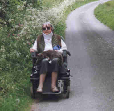 such as adjustable leg rests and a headrest. My cat circe also thinks its comfortable to sit on! One of the thins which I do from time to time is man a stand at various exhibitions, which the Coventry Council of Disabled has a stand. On one such exhibition, in Coventry, which I helped to organise, for the wheelchair users of Coventry, I was approached by one of the wheelchair salesmen, who was interested in my Squirell. He told me, that he had one like it which he had taken in part exchange but could not find anyone to buy with the spares situation being non existent. I did a deal to buy it off him very cheaply, trading in some parts which I had kept form my very first electric wheelchair, which were of more use to him. Thus it was that I acquired my fourth squirrel to date. I only live in a one bedroomed flat so you can imagine the difficulty I have with keeping them, but it is better to be safe than sorry, because the controller on one of them did start acting erratically and had to be replaced from another. I still like the wooden mark II best of all and would